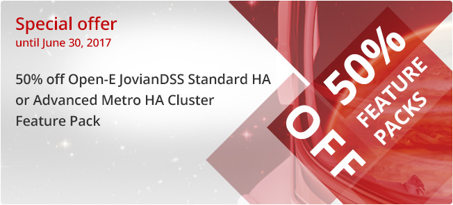Promotion reminder 50% discount on Open-E JovianDSS Feature Packs - Experience all the benefits of our High Availability Cluster solutions with a special discount thanks to which you will save 50% when buying one of the Open-E HA Cluster Feature Packs. -
