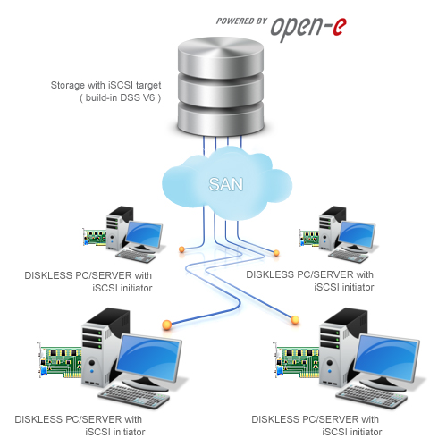 2.Host Bus Adapter (HBA) for every diskless PC or server as an iSCSI inicjator