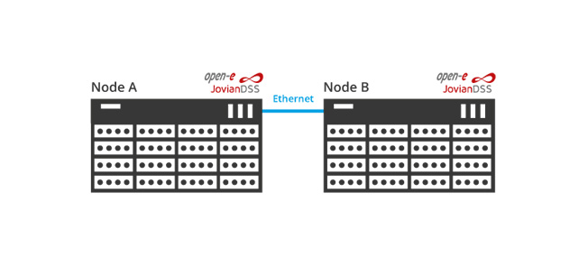 A Cluster over Ethernet is another solution with Open-E JovianDSS that is built of two nodes. Each node in the configuration has its own hard drives attached directly to the node and indirectly served over Ethernet to the other node (after internal conversion of the protocol). It allows for using a commodity server that is made up of only SATA drives which makes the solution very cost-effective. The nodes might be located a very long distance apart as a (stretched) metro storage cluster – 50 miles (80 km) or even more. For further info, read the solution article.