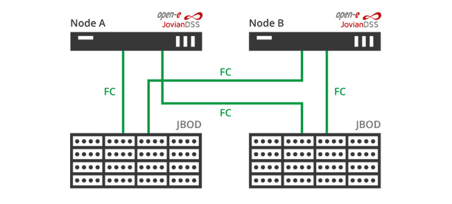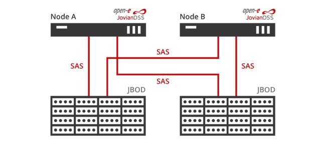 A High Availability Cluster with multiple JBODs over SAS with Open-E JovianDSS is a setup with two server heads connected to a shared storage with two (or more) redundant JBODs. The maximum distance between nodes is 33 ft (10 m). The solution enables avoiding Single Points of Failure (SPOF) because the drives are mirrored between JBODs. All hard drives on one node are shared with the other node, by means of a physical connection of HDDs to both nodes. For more info, go to the solution article.